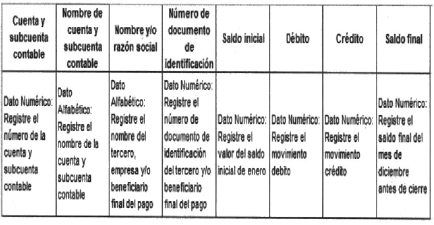 2.2.2 Debe estar detallado por tercero y contener los saldos de todas las cuentas y subcuentas de balance antes de cierre contable, en idioma español, al máximo nivel auxiliar, con corte anual (enero a diciembre) y utilizando una hoja de Excel por cada periodo fiscalizado.