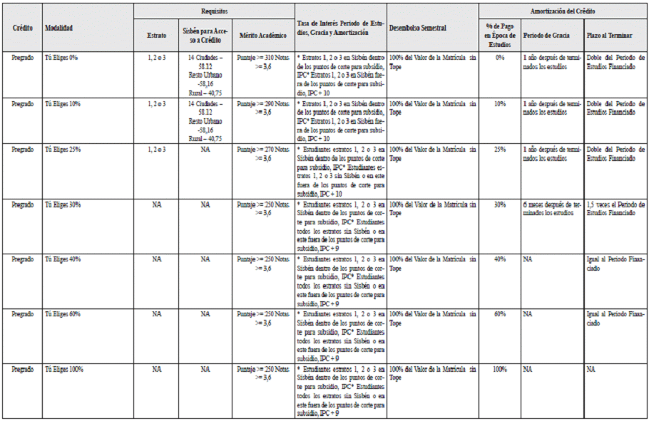 ARTÍCULO 31. ESTRUCTURACIÓN DE LAS CONDICIONES FINANCIERAS Y DE AMORTIZACIÓN DE LOS CRÉDITOS EDUCATIVOS. De acuerdo con las definiciones anteriores, las condiciones financieras de los créditos se enuncian a continuación: