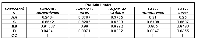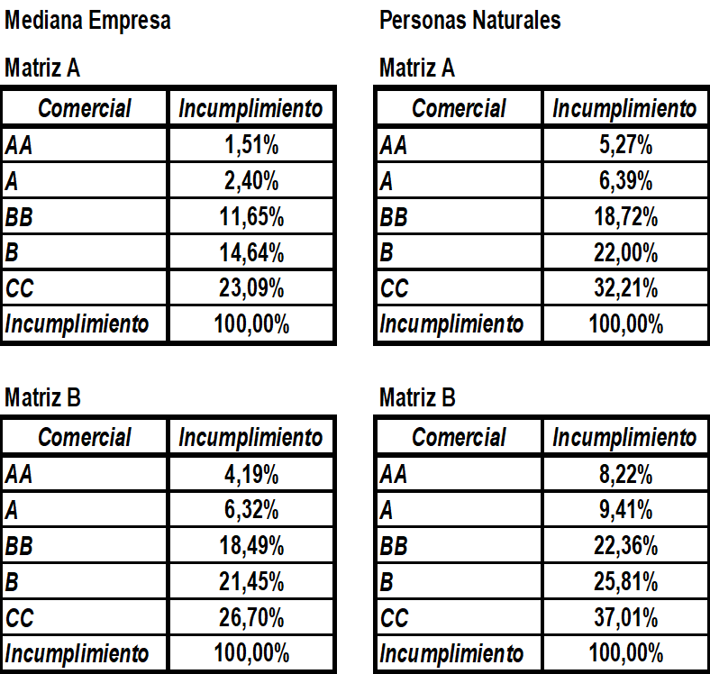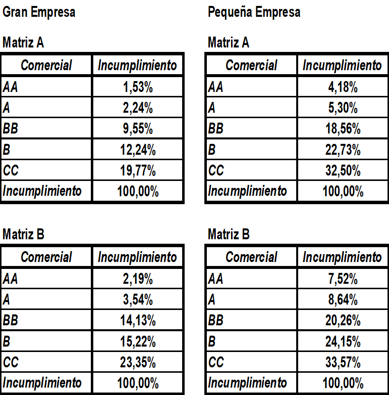 La probabilidad de incumplimiento se definirá de acuerdo con las siguientes matrices: