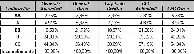 De esta manera, para cada deudor de cartera comercial se obtiene la probabilidad de migrar entre su calificación vigente y la calificación propia del incumplimiento en los próximos 12 meses de acuerdo con el ciclo del comportamiento general del riesgo de crédito. La SFC actualizará periódicamente las matrices con base en los datos que reporten las entidades en el formato 341.
