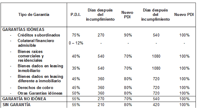 Se define como el deterioro económico en que incurriría la entidad en caso de que se materialice alguna de las situaciones de incumplimiento a que hace referencia el numeral 3 del presente Anexo. La PDI para deudores calificados en la categoría incumplimiento sufrirá un aumento paulatino de acuerdo con los días trascurridos después de la clasificación en dicha categoría. La PDI por tipo de garantía será la siguiente: