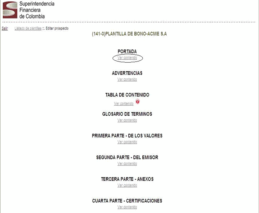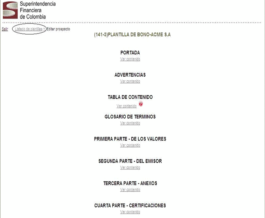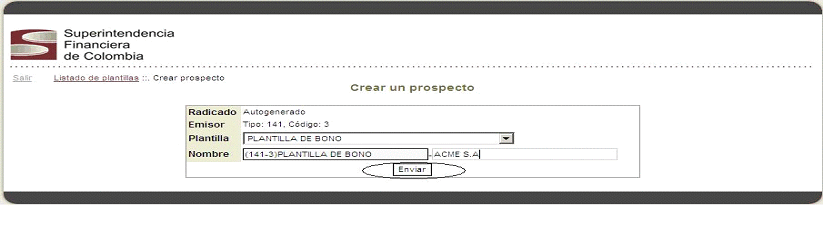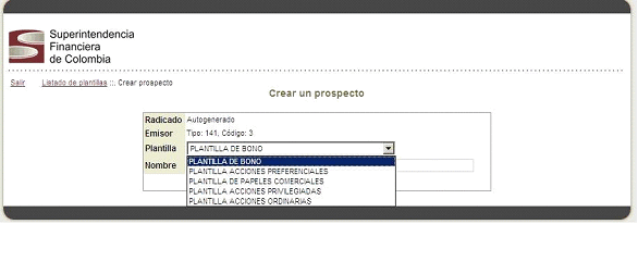· Plantilla: Define el tipo de prospecto que se va a diligenciar (bonos, acciones ordinarias, acciones preferenciales, acciones privilegiadas, o papeles comerciales).