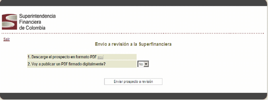 · Enviar a revisión: Una vez diligenciado completamente el prospecto este botón permite enviar el prospecto a la Superfinanciera.