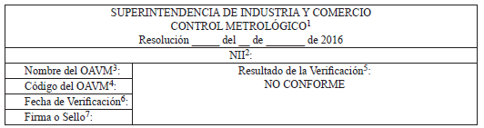 Características de la Etiqueta. La etiqueta de marcado de no conformidad del instrumento de medición debe estar confeccionada con un material resistente a los agentes externos, tanto atmosféricos como abrasivos y a los impactos. Será de tipo adhesivo y autodestructiva al desprendimiento; debe tener forma rectangular, fondo de color rojo y sus dimensiones deben ser suficientemente grandes para permitir que los usuarios del instrumento se informen sobre su no conformidad con el presente reglamento técnico.
