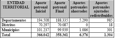 La distribución se realiza con los mismos procedimientos previstos y normas vigentes aplicables en el Conpes Social 106 y 110 de 2007(8). El cuadro 1 presenta la distribución de los recursos ahorrados y los recursos ajustados, por concepto de aportes patronales, los cuales se encuentran en el anexo 1 y 2.