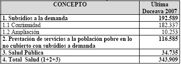 El monto a distribuir como última doceava de la participación para salud para 2007 asciende a $343.909 millones, con los cuales, de acuerdo con el artículo 47 de la Ley 715 de 2001, se financian tres componentes de gasto: i) Régimen subsidiado (Subsidios a la Demanda)(10); ii) Prestación del servicio de salud a la población pobre no asegurada y acciones No POS(11); y iii) acciones en salud pública(12). Su distribución por componente se presenta en el Cuadro 2