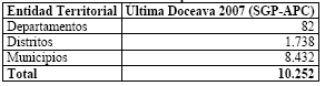 Como consecuencia de lo anterior, la distribución resultante en el 2007 para el total de municipios, distritos y departamentos se presenta en el cuadro 7 (última doceava vigencia 2007).