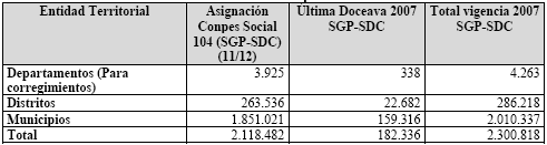 En el caso de la participación para educación los documentos Conpes Social 104, 107 y 110 de 2007 aprobaron lo distribución de los recursos de once y última doceava de la participación para educación de 2007 y la distribución de los recursos de la participación para educación por concepto del crecimiento real de la economía superior al 4%.