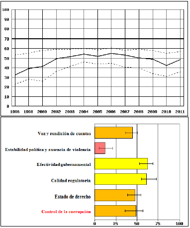 12. Los WGI identifica más de 35 fuentes individuales de datos sobre la percepción de la gobernabilidad, entendida como el conjunto de instituciones formales e informales que determinan el modo en que es ejercida la autoridad en un país, en 212 países para las siguientes seis dimensiones: 1. voz y rendición de cuentas, 2. estabilidad política y ausencia de violencia, 3. efectividad gubernamental, 4. calidad regulatoria, 5. Estado de Derecho y 6. control de la corrupción. Para que la evaluación de un país en el indicador se considere "positiva" la misma tiene que superar los 50 puntos sobre 100.