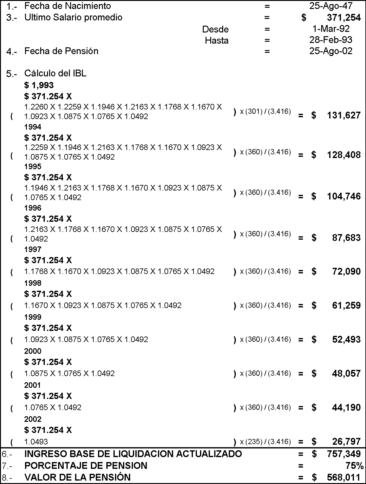 En consecuencia, totalizando los anteriores rubros nos da el Ingreso Base de Liquidación de la mesada pensional del actor, debidamente indexada año por año, esto es, la suma de $ 483.147,32, que multiplicada por el 75%, arroja la cantidad de $ 362.360,49, que es el valor de la pensión a la que tiene derecho el promotor del proceso a partir del día 30 de diciembre de 1997...".