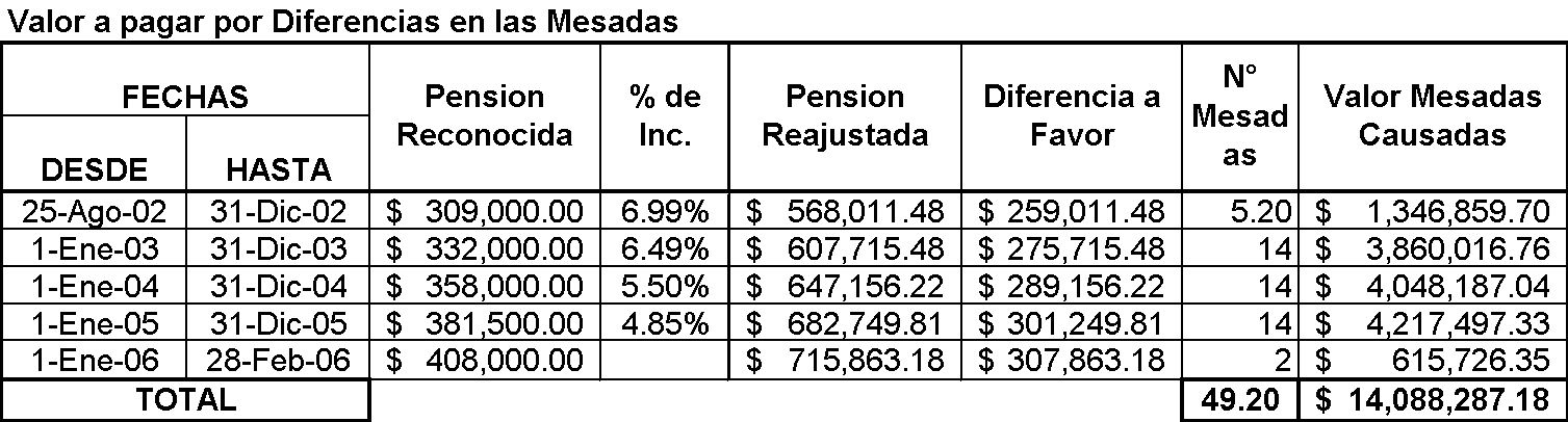De los anteriores cálculos, se desprende en resumen, que el monto inicial de la pensión, a partir del 25 de agosto de 2002, debió ser $568.011,48; y el valor de la diferencia causada entre tal fecha y el 28 de febrero de 2006, es de $14'088.287,18; además el valor de la pensión para el año 2006, teniendo en cuenta los aumentos legales, es de $715.863,18.