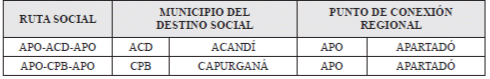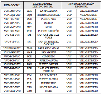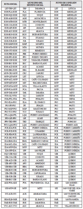ARTÍCULO 2.6.2.2.1.1.1. RUTAS SOCIALES SUJETAS A SUBVENCIÓN. <Artículo modificado por el artículo 1 del Decreto 439 de 2019. El nuevo texto es el siguiente:> Para efectos del otorgamiento por parte del Ministerio de Defensa Nacional de las subvenciones de que trata el artículo 240 de la Ley 1753 de 2015 durante la vigencia 2019, podrán ser objeto de subvención siempre y cuando el requisito de exclusividad se mantenga, las siguientes rutas sociales en las cuales Satena S. A. es el único operador en ciclo completo: