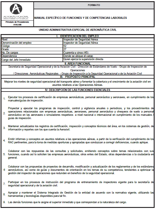 Que a través de la Resolución número 2154 del 26 de julio de 2018 publicada en el Diario Oficial el día 1 de agosto de 2018, se modificó el Manual Específico de Funciones y de Competencias Laborales, para los empleos denominados Inspector de Seguridad Aérea asignados al Grupo de Inspección de Operaciones de la Dirección de Estándares de Vuelo (Pilotos) de la Unidad Administrativa Especial de la Aeronáutica Civil.