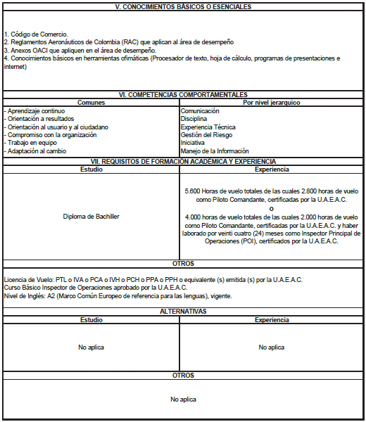 | Diploma de Bachiller | 6.400 horas de vuelo totales de las cuales 3.200 horas de vuelo como Piloto Comandante, certificadas por la U.A.E.A.C., o 4.000 horas de vuelo totales de las cuales 2.000 horas de vuelo como Piloto Comandante, certificadas por la U.A.E.A.C., y haber laborado por treinta y seis (36) meses como Inspector Principal de Operaciones (POI), certificados por la U.A.E.A.C. |