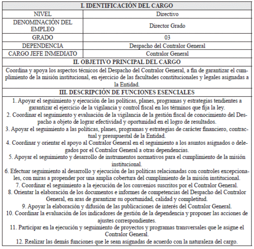 ARTÍCULO 1o. Adicionar el Manual Específico de Funciones, Requisitos y Competencias Laborales de los Empleos Públicos de la Planta Global de la Contraloría General de la República, en el sentido de establecer las siguientes funciones para el cargo de Director Grado 03 en el Despacho del Contralor General.