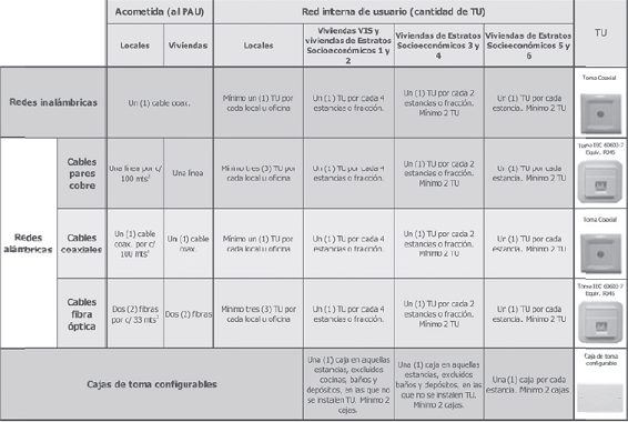 | Entre 21 y 40 | 6 | Un (1) ducto para cable coaxial Dos (2) ductos para cable multipar, par trenzado Un (1) ducto para F. O. Dos (2) ductos de reserva |