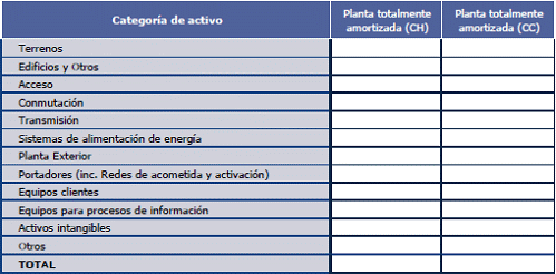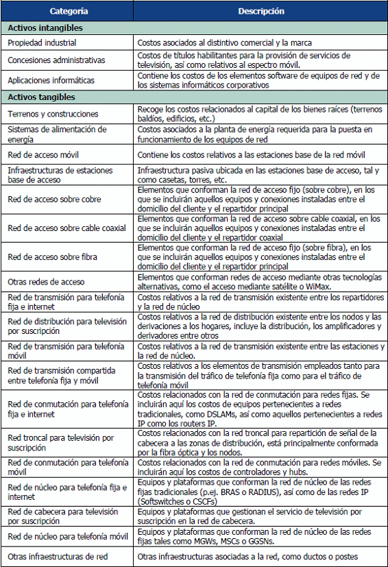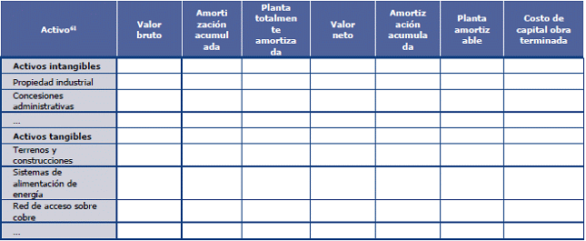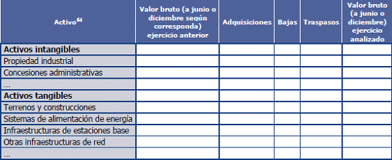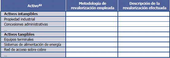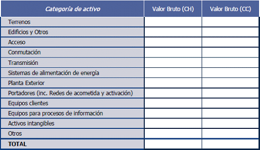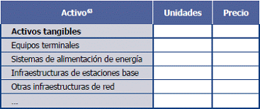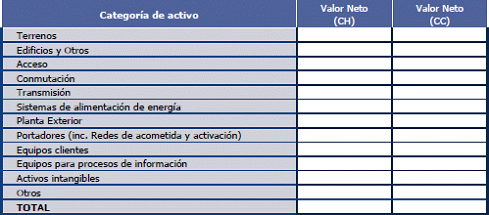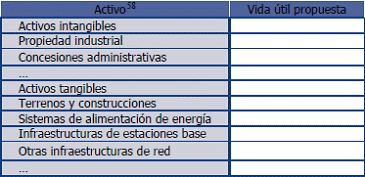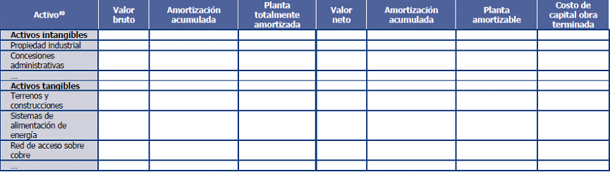 63. Los activos presentados en esta tabla son ilustrativos, y deberán corresponder con aquellos activos que hayan sido valorados a corrientes mediante el método de valoración absoluta por el operador