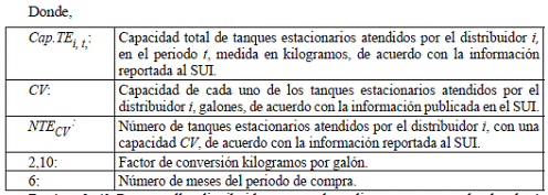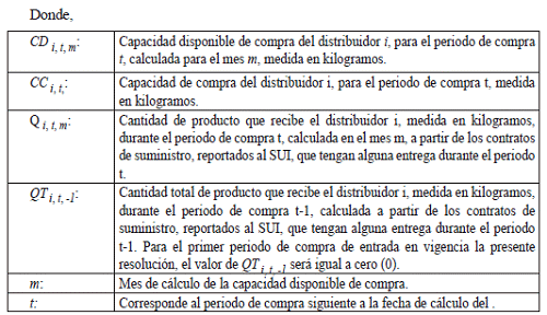 | CCi,t: | Capacidad de compra del distribuidor i, para el periodo de compra (t = 3), medida en kilogramos, definida en los actos administrativos particulares expedidos por la CREG. |