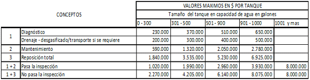 a) Para los tanques estacionarios con capacidad individual igual o menor a 1.000 galones de agua, que estén siendo utilizados para prestar el servicio público domiciliario de GLP, se pagará la totalidad de los costos sin superar en ningún caso los valores estimados de inspección, mantenimiento o reposición, según el caso, que se indican a continuación.