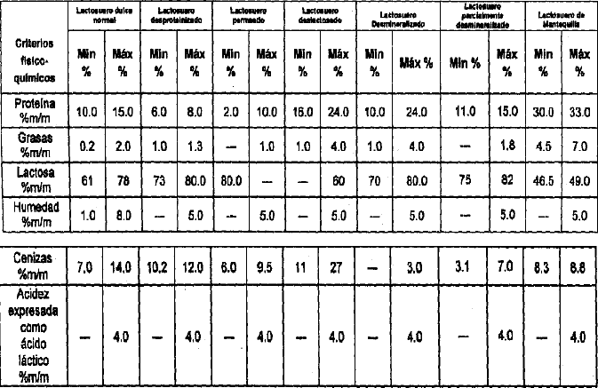 Los lactosueros en polvo deben cumplir con los siguientes requisitos fisicoquímicos y microbiológicos: