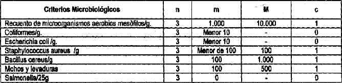 | Recuento de hongos y levaduras/g. | 3 | 100 | 500 | 1 |