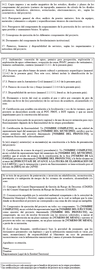 9.1. Documentales: Los proyectos que presenten las entidades ante el Viceministerio de Agua y Saneamiento Básico, deberán ser radicados con la totalidad de la documentación que se relaciona en la Guía de presentación de proyectos de agua potable y saneamiento básico, organizados en carpetas de tamaño oficio, debidamente foliadas.