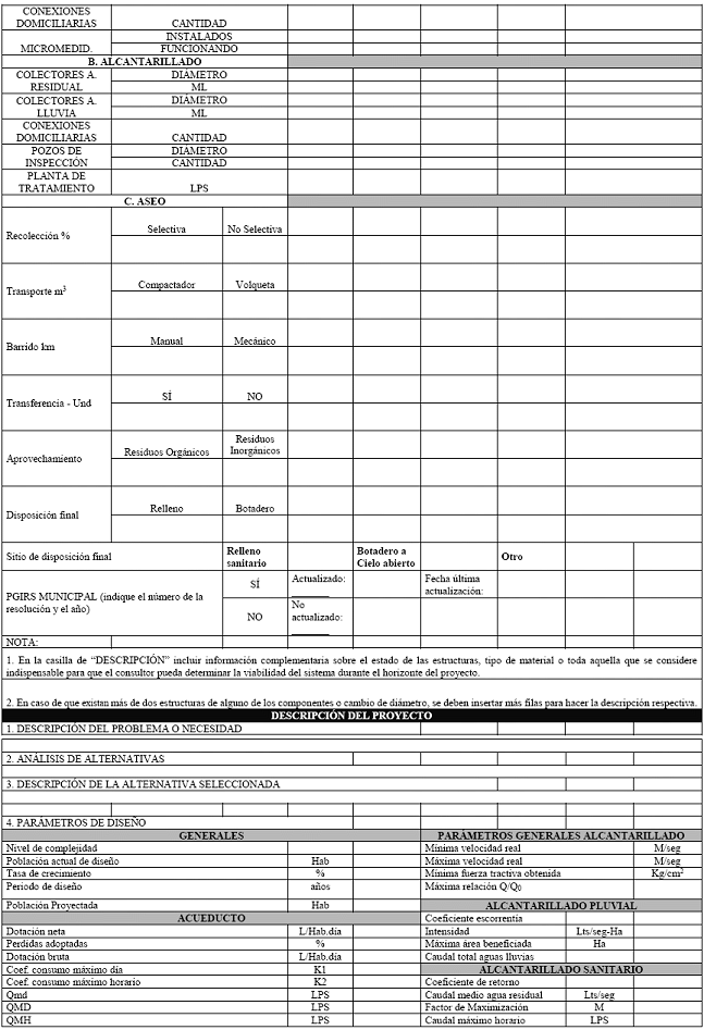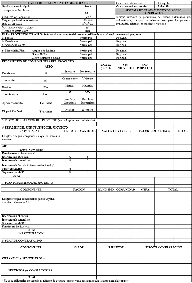 Asimismo, el Comité Técnico del Viceministerio de Agua y Saneamiento Básico del Ministerio de Vivienda, Ciudad y Territorio, requiere la presentación de un cuadro que incluya las siguientes columnas del presupuesto presentado para reformulación: