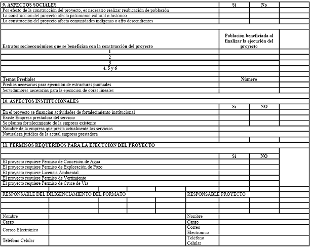 ARTÍCULO 9o. REQUISITOS PARA LA PRESENTACIÓN DE PROYECTOS. Los proyectos que presenten las entidades, deberán hacer parte de las Políticas y/o de los Programas implementados o que implemente la Nación para el sector de agua potable y saneamiento básico, en concordancia con la normativa aplicable al sector. La entidad solicitante deberá presentar la totalidad de los documentos exigidos en la presente resolución en los formatos establecidos en la Guía de Presentación de Proyectos de Agua Potable y Saneamiento Básico contenida en Anexo número 1 de la presente y cumplir los siguientes requisitos: