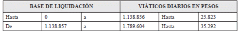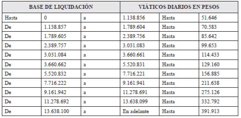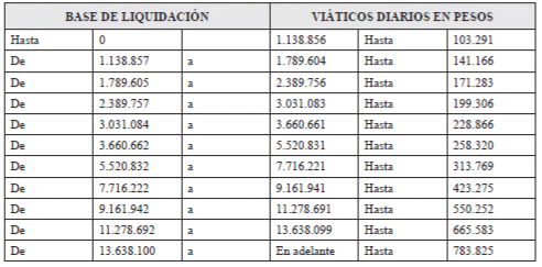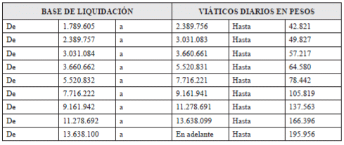 Quinto. Que para la base de liquidación de los gastos de desplazamiento de los contratistas, se tendrán en cuenta las tablas que se fijan más adelante para definir los viáticos previstos para los servidores públicos.