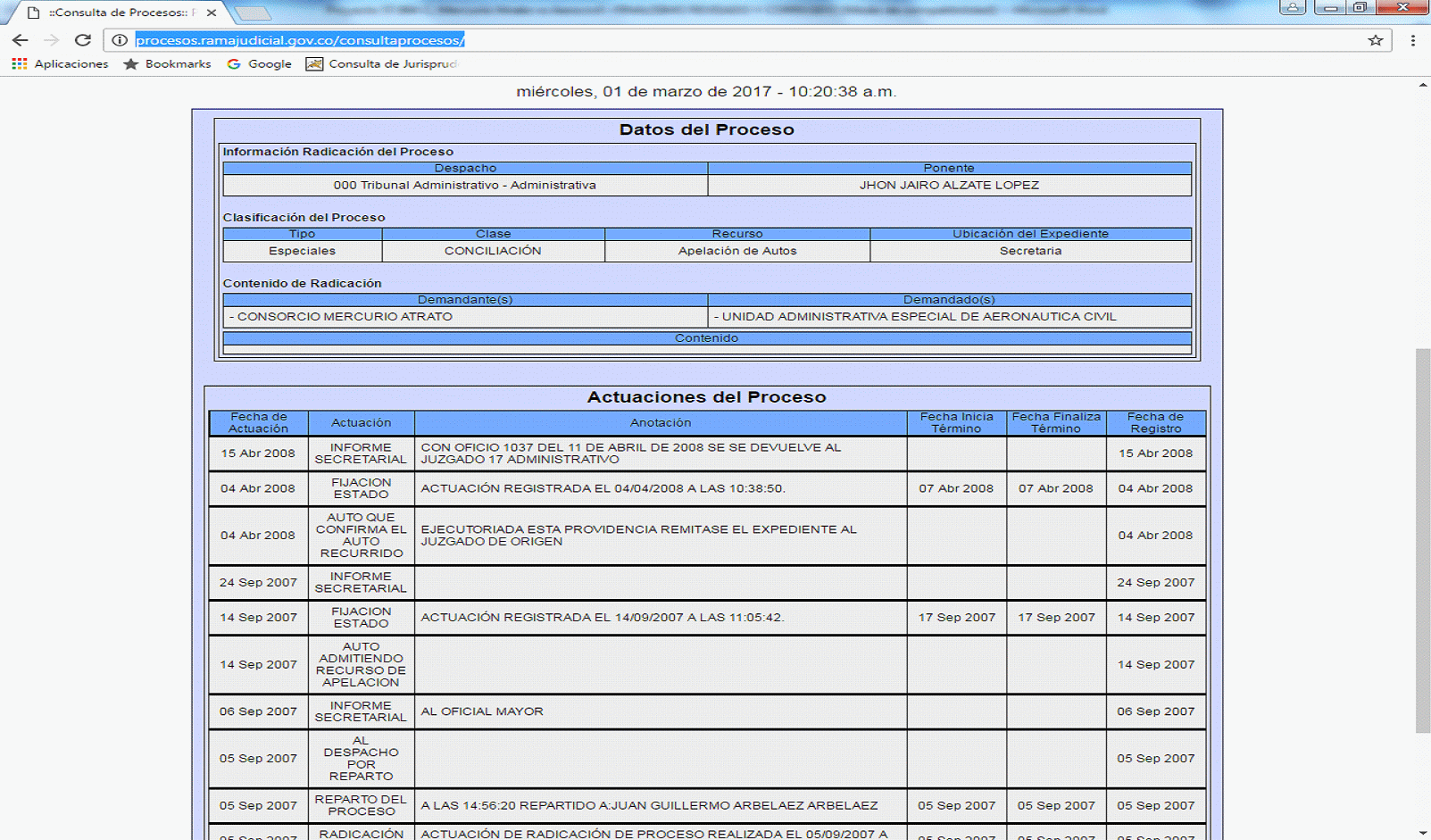Ese recurso se admitió por auto del 14 de septiembre de 2007 y mediante auto del 4 de abril de 2008 se confirmó lo dispuesto en la providencia del 28 de junio de 2007 en el sentido de improbar la conciliación prejudicial a la que llegaron las partes en la audiencia de conciliación que tuvo lugar el 25 de mayo de 2007, providencia que se notificó por Estado el 7 de abril de 2008 y quedó ejecutoriada el 10 de abril de 200http://procesos.ramajudicial.gov.co/consultaprocesos/