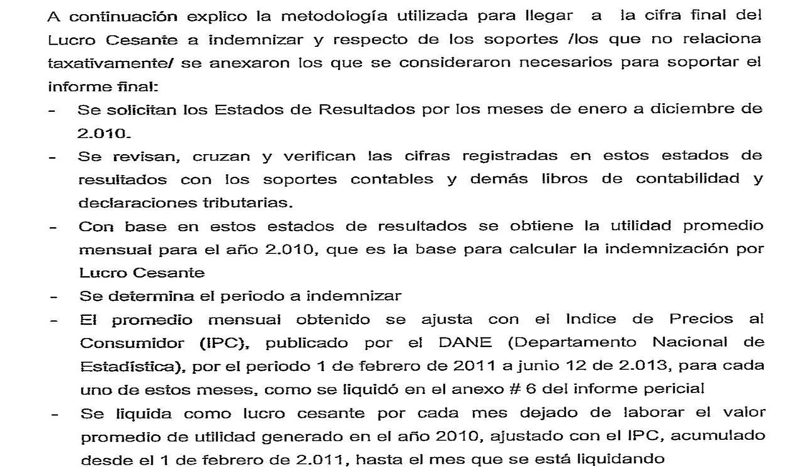 El municipio de Manizales solicitó la aclaración y complementación del dictamen, el 23 de julio de 2013. En respuesta, el 8 de agosto de 2013, el perito lo reiteró, y se pronunció de forma concreta sobre cuál fue la metodología utilizada para la realización del dictamen, así: