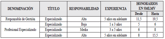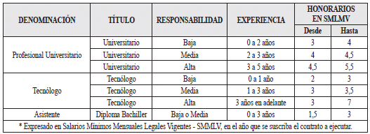 En efecto, a continuación se presenta un cuadro que contendrá la unificación de los honorarios, contemplando criterios como las actividades a desarrollar, las personas bajo su liderazgo y orientación, la especialización y experiencia.