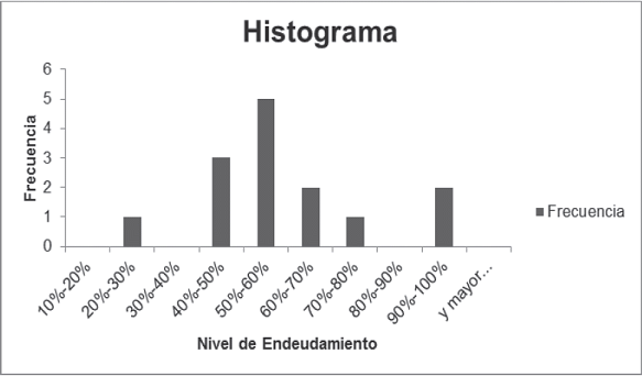 Es una representación gráfica de la muestra en forma de barras, en donde la altura de cada una de estas representa la frecuencia de datos. El análisis del gráfico permite inferir el comportamiento de la muestra. Las conclusiones son similares a las expuestas en el anterior gráfico. A continuación un ejemplo a partir de los siguientes datos de nivel de endeudamiento.