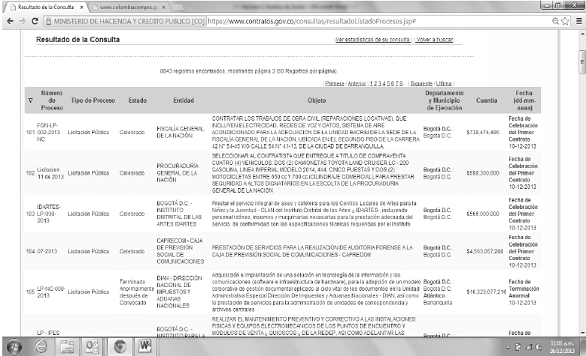 Paso 4: El sistema presenta los diferentes contratos que tienen que ver con el producto o servicio que está buscando. Haga clic en el número del proceso de su interés (busque principalmente los Procesos de Contratación cuyo estado sea celebrado).