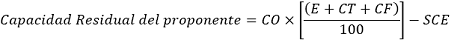 El cálculo de la Capacidad Residual del Proceso de Contratación debe incluir los factores de Experiencia (E), Capacidad Financiera (CF), Capacidad Técnica (CT), Capacidad de Organización (CO) y los Saldos de los Contratos en Ejecución, según la siguiente fórmula: