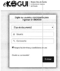 Paso 1. Para tener acceso al Sistema, el usuario debe comunicarse al interior de su entidad con el Administrador del sistema e-KOGUI en la entidad y solicitar la creación de usuario del perfil requerido en cada entidad, según sus funciones (apoderado, Jefe de Control Interno, etc). Los apoderados que representen más de una entidad deben solicitar la creación del usuario a cada Administrador del sistema e-KOGUI en la entidad.