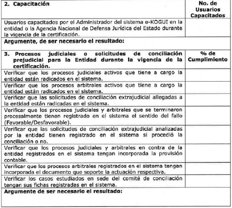 | 2.Gestionar con los usuarios del Sistema Único de Gestión e Información Litigiosa del Estado e-KOGUI en la entidad las solicitudes de verificación, corrección e incorporación de información que realice la Agencia Nacional de Defensa Jurídica del Estado, en los plazos que ésta establezca. | MEDIO DE VERIFICACIÓN: • Comunicaciones de requerimientos remitidas a la ANDJE, si aplica. • Plazo: Ver Instructivo - Perfil Administrador del sistema e-KOGUI en la entidad. |