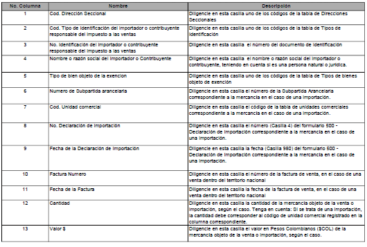 “2.3. El responsable del Impuesto sobre las Ventas (IVA) deberá rendir un informe de ventas con corte al último día de cada mes, el cual deberá ser remitido dentro de los 5 primeros días del mes siguiente a la Dirección Seccional de Impuestos y Aduanas que corresponda al domicilio fiscal del responsable del impuesto sobre las ventas que efectúa la venta exenta, certificado por contador público o revisor fiscal, según sea el caso, en el cual se detallen las facturas o documentos equivalentes, registrando número, fecha, cantidad, especificación del bien y valor de la operación.