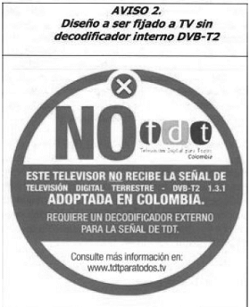 Sin perjuicio del cumplimiento de las obligaciones adicionales de información y publicidad a los consumidores establecidas por la ley y demás normas complementarias, con el fin de garantizar que el consumidor esté informado acerca de las condiciones técnicas de los receptores de televisión (televisor y/o Set Top Box-STB) al momento de la compra, a todo receptor de televisión (televisor y/o Set Top Box-STB) que se venda, distribuya o comercialice en el país se le deberá fijar tanto al equipo exhibido como a todas las cajas del producto, en lugar visible a primera vista por parte del consumidor, el aviso informativo que corresponda según las siguientes reglas: