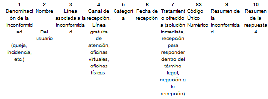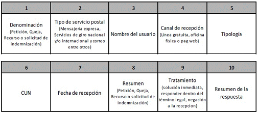 De conformidad con el artículo 23 del RPUPO, el formulario debe contener como mínimo el nombre completo e identificación del usuario, la fecha de imposición del objeto postal, el nombre completo, dirección (física y/o de correo electrónico) del remitente y del destinatario, el campo del Código Único Numérico (CUN) en el que el proveedor incluirá el número asignado y los hechos en que se fundamenta la Petición, Queja, Recurso (PQR) o la Solicitud de Indemnización.
