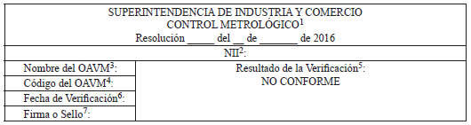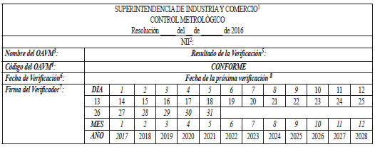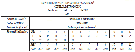 9.14. SUPERACIÓN DE LA VERIFICACIÓN METROLÓGICA. <Numeral adicionado por el artículo 1 de la Resolución 88919 de 2017. El nuevo texto es el siguiente:> Cuando el resultado de la verificación metrológica sea satisfactorio, el OAVM adherirá en lugar visible del alcoholímetro evidencial una “etiqueta de verificación” cuyas características, formato y contenido serán los siguientes: