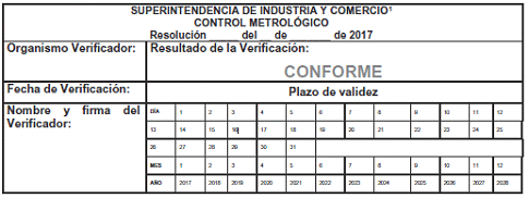 5. Próxima verificación: Corresponde a la fecha límite en la cual se vence la verificación metrológica periódica practicada por el OAVM. En este campo, se deberá perforar las casillas correspondientes al día, mes y año en que se vence la verificación periódica.