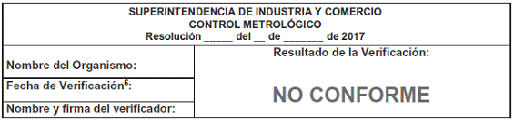 Todo alcohosensor que no haya superado la verificación metrológica dispuesta en este reglamento técnico metroiógico, deberá llevar adherida una etiqueta fijada en un lugar visible del instrumento de medición, ya sea en el visor o en algún elemento de la instalación que lo soporta, cuyas características, formato y contenido, serán los siguientes: