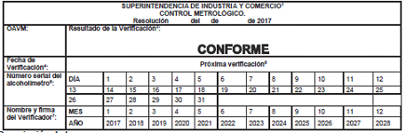 A partir del 30 de junio de 2020 todos alcoholímetros que sea utilizado en actividades periciales, judiciales y/o administrativas, deberán ser verificados metrológicamente en la forma que se señala en este reglamento técnico.