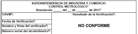 Se debe entregar al titular del alcoholímetro el acta de verificación metrológica donde consten las no conformidades encontradas y los resultados de las pruebas y los ensayos efectuados. En el acta se debe advertir al titular que el instrumento no puede ser utilizado con fines periciales, judiciales y/o administrativos.