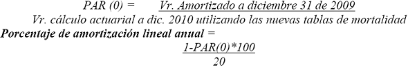 Los aumentos o disminuciones en las reservas actuariales, deberán registrarse en los resultados de cada período contable, teniendo en cuenta lo establecido en el decreto 4565 de 2010 artículo 1o: “El porcentaje de amortización que se establezca con respecto al alcanzado a diciembre de 2009, y lo que falta por provisionar, deberá amortizarse a partir de los estados financieros con corte a diciembre 31 de 2010 hasta el año 2029, en forma lineal de acuerdo con la siguiente metodología. Lo anterior sin perjuicio de terminar dicha amortización antes de 2029.