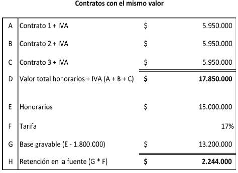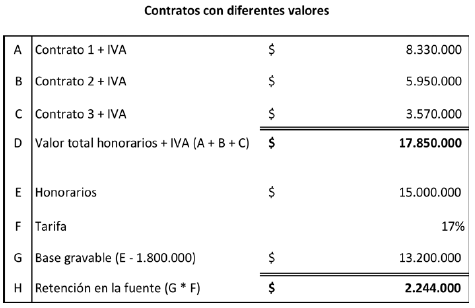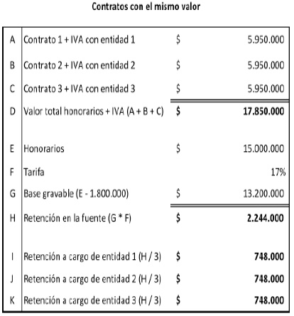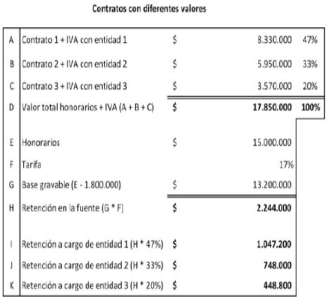 Una vez se valide si procede la retención en la fuente a título del impuesto solidario por el COVID-19, cada agente de retención deberá practicar la retención en la fuente en la proporción que le corresponda. Teniendo en cuenta las anteriores consideraciones, este Despacho expondrá algunos ejemplos de la manera como se determina el impuesto solidario por el COVID-19, cuando se trate de personas naturales vinculadas mediante 2 o más contratos de prestación de servicios profesionales y de apoyo a la gestión pública, así: