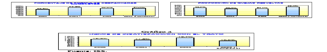 Se destaca como principales resultados de la evolución de los indicadores de calidad en la prestación de servicios de salud para el periodo 2003-2006 la mejoría en los indicadores de: (i) porcentaje de fórmulas despachadas completas al pasar de 59.9% a 71.1% (ii) insatisfacción con el trato al pasar de 12.9% a 10.2% y; (iii) proporción de quejas resueltas con un resultado alrededor de 68%. Por otro lado, se presenta una evolución en los índices de tiempos promedio de espera en consulta de medicina especializada y en consulta general.