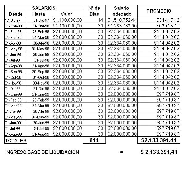 Así las cosas, y de acuerdo con la prueba documental que reposa a folio 63 a 65, entre el 17 de diciembre de 1997 y el 30 de agosto de 1999, lapso en el que transcurrió 1 año, 8 meses y 23 días, la accionante tuvo un salario base de cotización promedio indexado de $2'133.391,41.