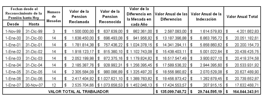 En este orden de ideas y llevadas a cabo las operaciones de rigor, se condenará al Instituto demandado a reconocer y a pagar a favor de la demandante las siguientes sumas de dinero: $135.099.748,72, correspondiente al mayor valor de la mesada pensional causada entre el 1 de noviembre de 1999 y el 31 de agosto de 2007, más $29.744.595,19, a título de indexación generada por el pago insoluto del anterior concepto.
